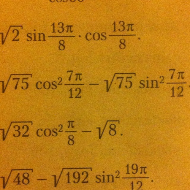1)sqrt{2}sinfrac{13pi}{8}cosfrac{13pi}{8}=frac{sqrt2}{2}sinfrac{26pi}{8}=frac{1}{sqrt2}}sinfrac{13pi}{4}=frac{1}{sqrt2}*-frac{1}{sqrt2}=-0.5\\2)sqrt{75}cos^2frac{7pi}{12}-sqrt{75}sin^2frac{7pi}{12}=sqrt{75}*cosfrac{14pi}{12}=5sqrt{3}*-frac{sqrt3}{2}=-7.5\\3)sqrt{32}cos^2frac{pi}{8}-sqrt8=sqrt8(2cos^2frac{pi}{8}-1)=2sqrt2*cosfrac{pi}{4}=2sqrt2*frac{1}{sqrt2}=2