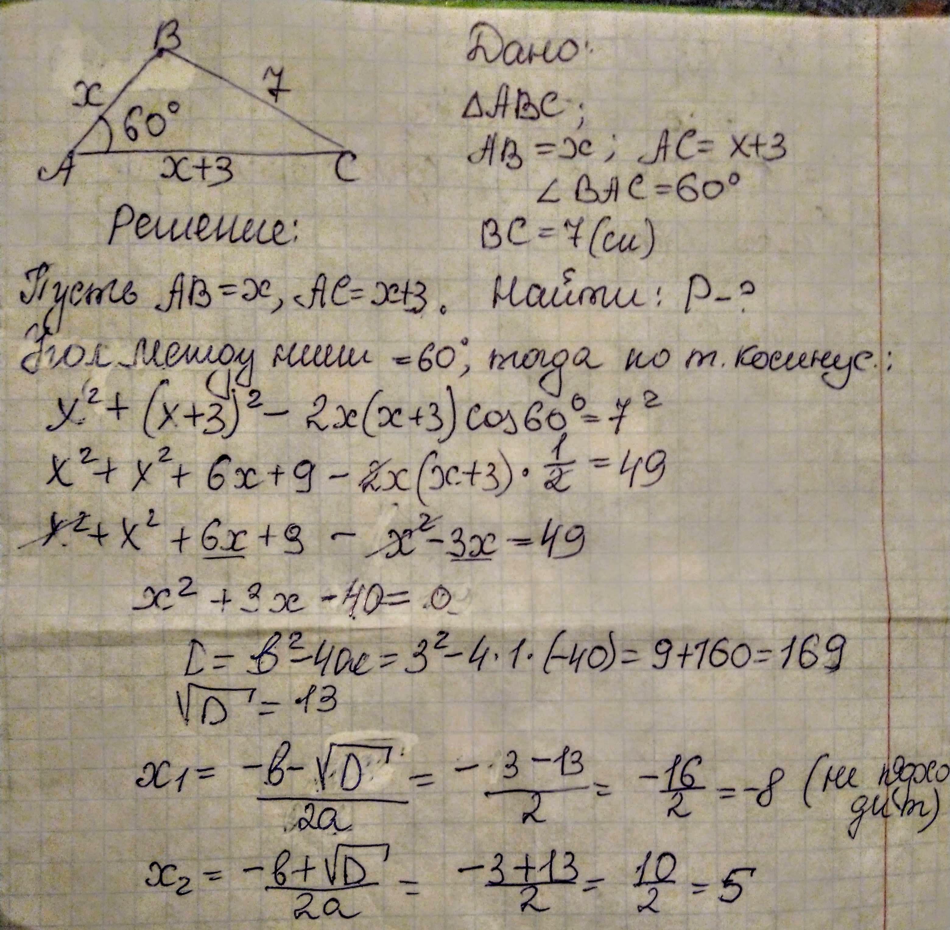 Одна сторона треугольника на 3 см меньше другой, а угол между ними равен 60°. Найдите периметр треугольника, если его третья сторона равна 7 см.