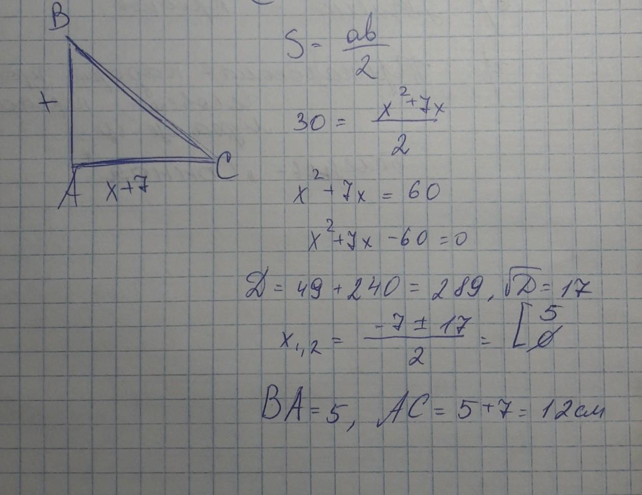 N3. Найдите катеты прямоугольного треугольника, если известно, что один из них на7см больше другого, а площадь этого треугольника равна 30 см..
