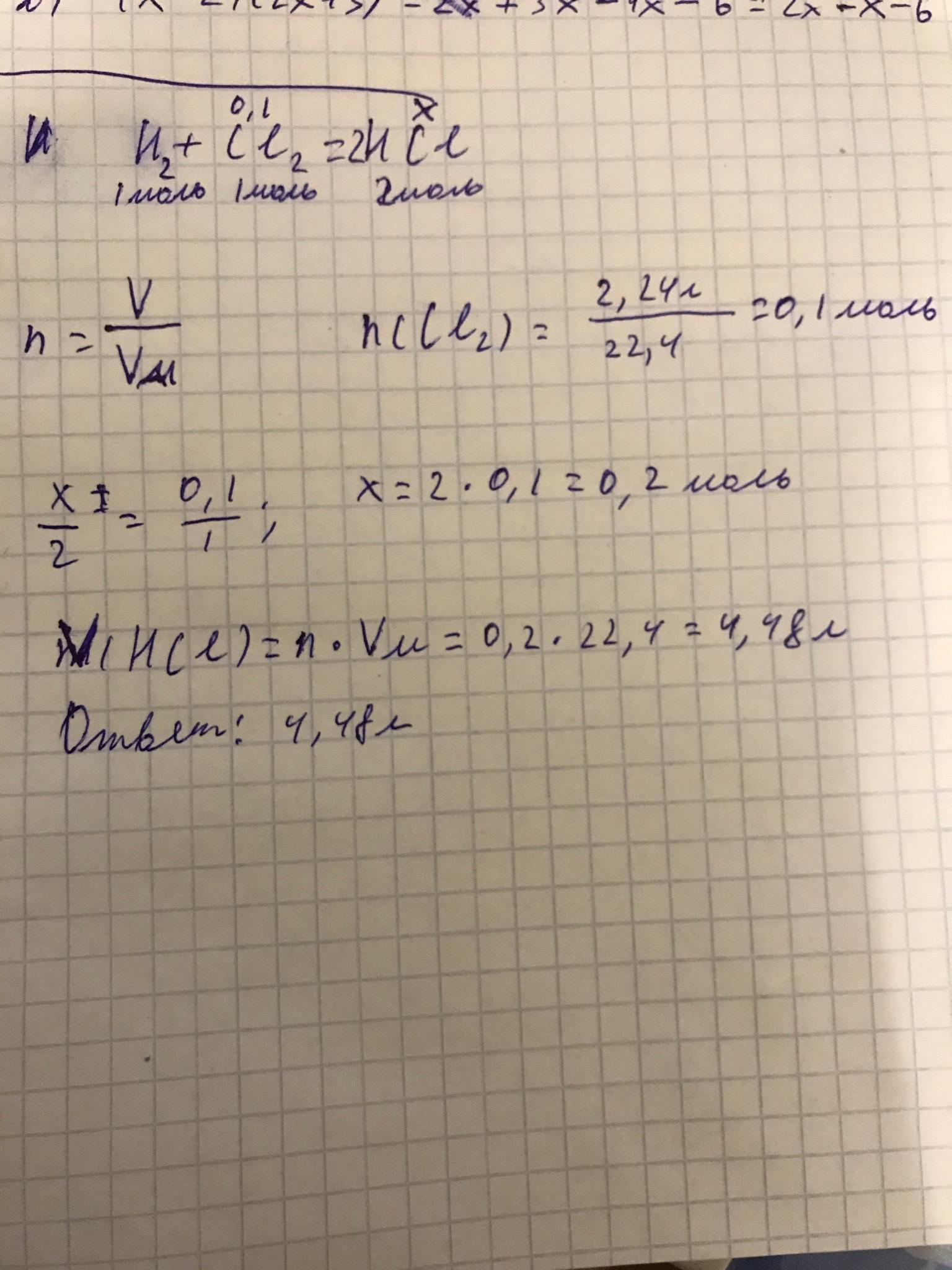 Рассчитайте какой объем (н.у.) хлороводорода может образоваться при взаимодействии 2.24 л (н.у.) хлора с водородом
