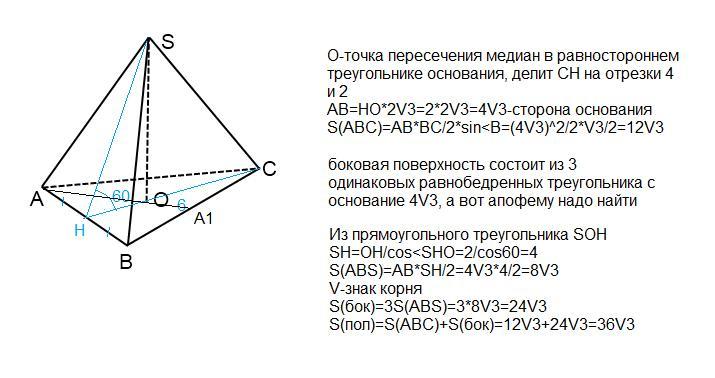 Знайдіть площу повної поверхні правильної трикутної піраміди, висота основи якої дорівнює 6 см, а кут між площинами основи і бічної грані дорівнює 60°.