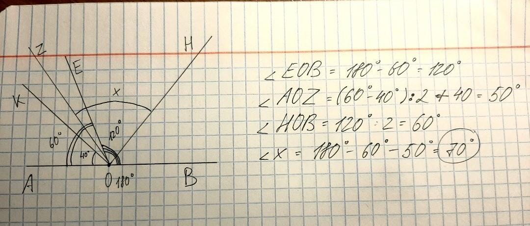 От стороны развернутого угла AOB в одну полуплоскость отложены уголAOK=40градусом и уголAOE=60градусов. Найдите угол между биссектрисами углов KOE и EOB