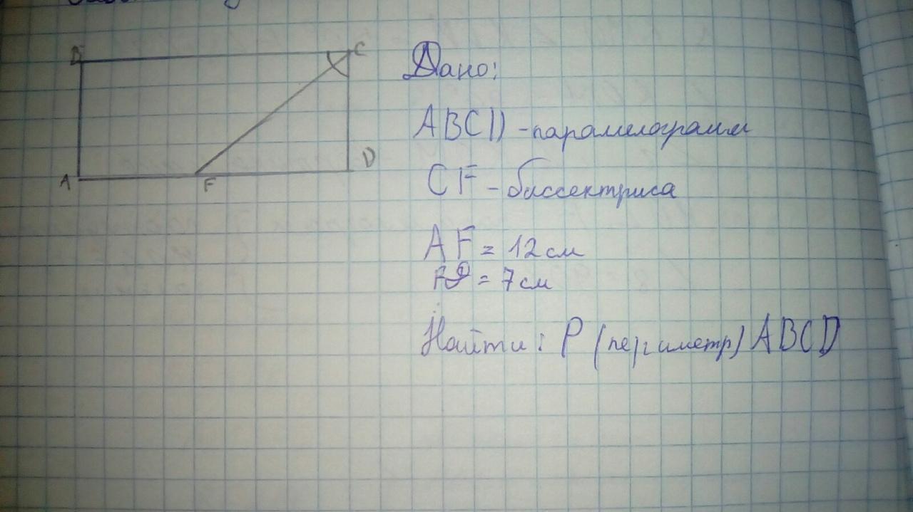 Если данный параллелограмм - прямоугольник, то биссектриса выходит из прямого угла и она равна 45°, следовательно, FD=DC (т.к. FDC - равнобедренный треугольник). Остаётся лишь посчитать сумму сторон: