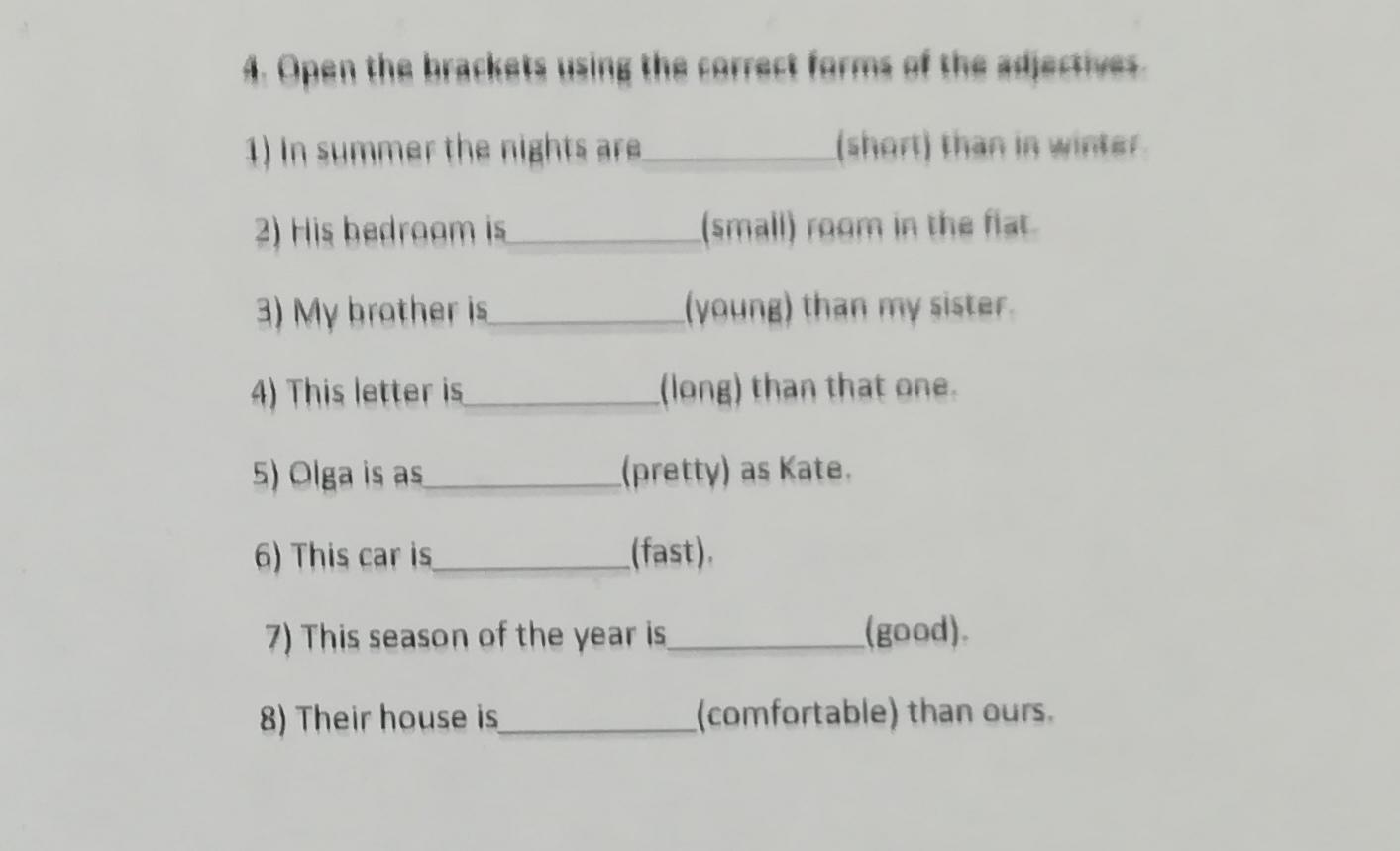 1shorter 2the smallest 3younger 4longer5pretty 6the fastest 7the best 8more comfortable