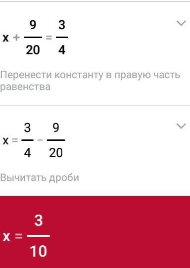x =3/4 -9/20 = 15/20 -9/20=6/20= 3/10 = 0.3