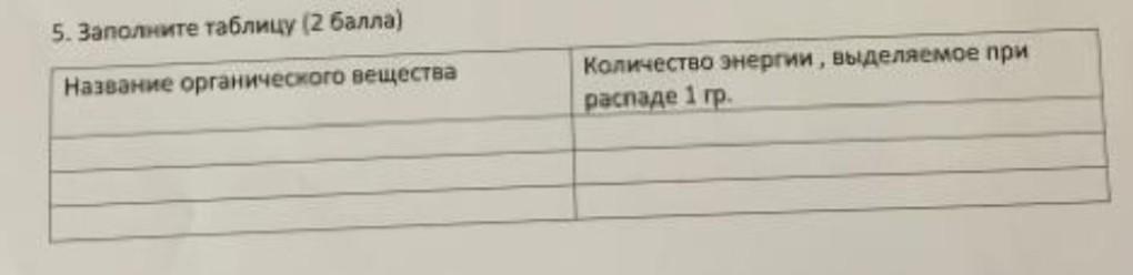 Заполните таблицу.Название органического вещества. Количество энергий,выделяемое при распаде