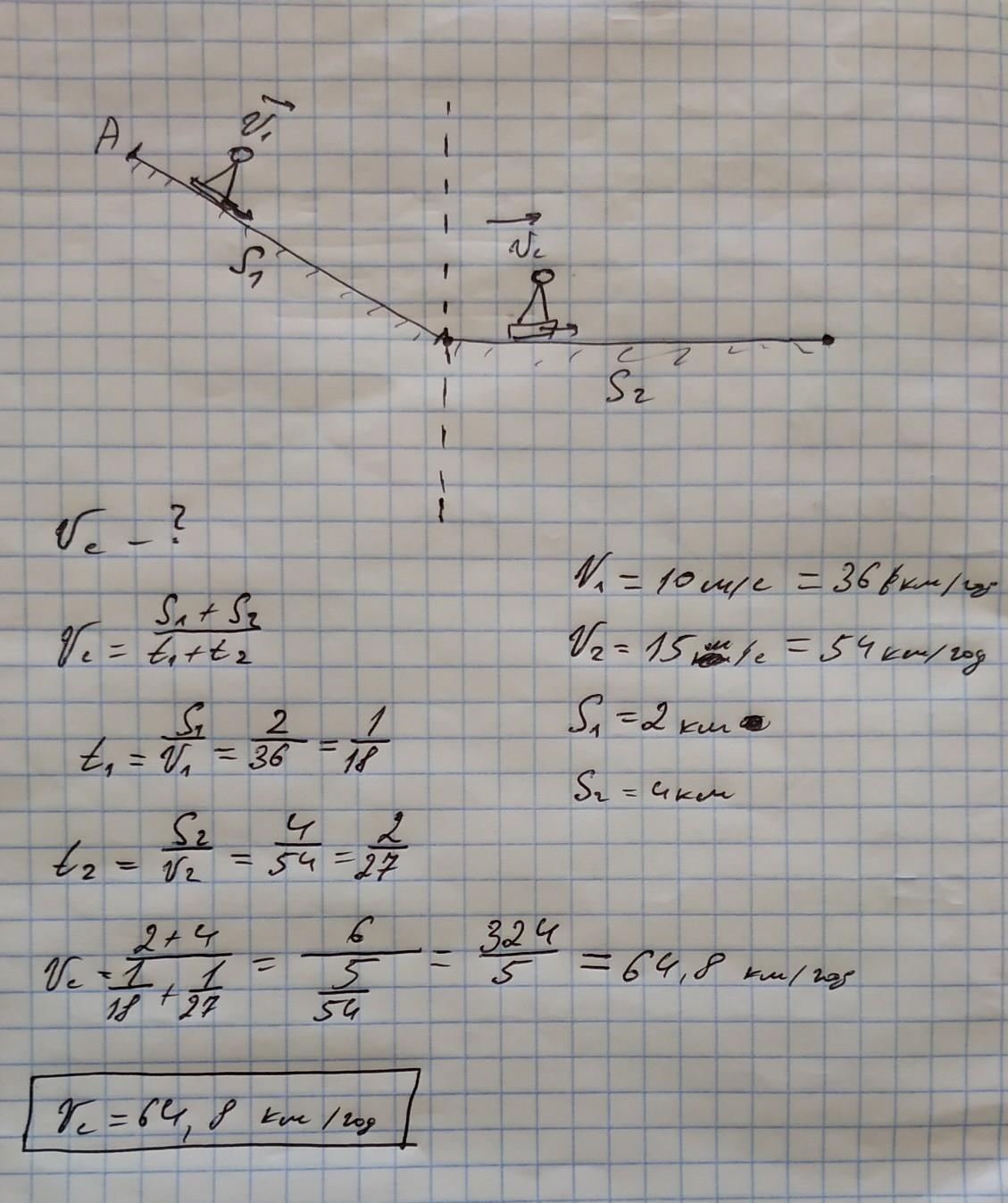Спускаясь с горы со скоростью 10м/с, лыжник проходит 2 км пути, затем двигается 4 км по прямой со скоростью 15км/с. Определите среднюю скорость лыжника на всём пути.