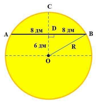 Решение. Диаметр или радиус, перпендикулярный к хорде, делит эту хорду и обе стягиваемые ею дуги пополам. Если из центра окружности провести перпендикулярный радиус ОС, радиус ОС делит хорду АВ пополам, то есть AD=DB=8 дм.