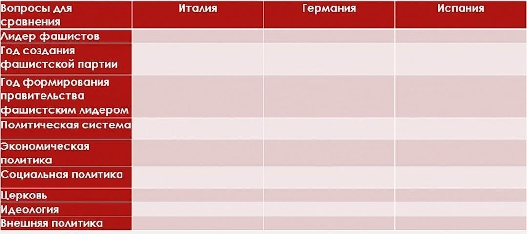 италия - Муссоллини, Германия Гитлер Испания Франко. Италия 1921 Германия 1920 Испания 1933. Формирование правительства-Италия-1928(не точно) Гер-1933 Исп-1936. Экономическая полтника-корпоративизм. Социальная политтка- . Церковь-католицизм. Идеология-Фашизм, национализм, германия-антисемитизм.