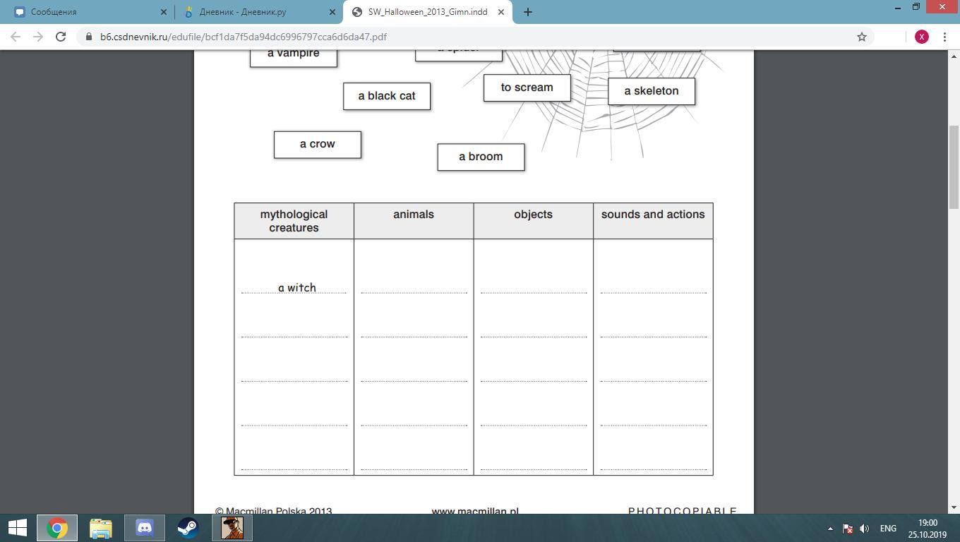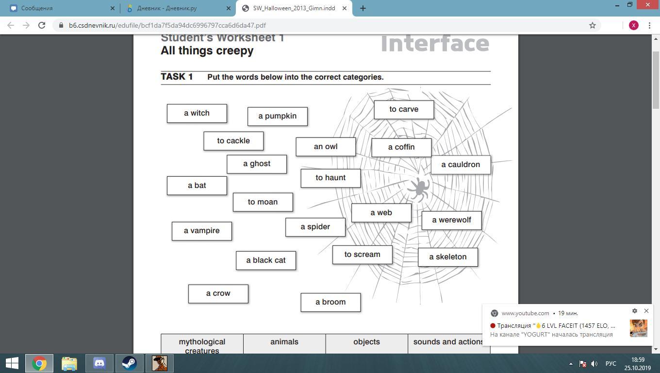 Objects: a pumpkin, a coffin, a cauldron, a web, a skeleton, a broom