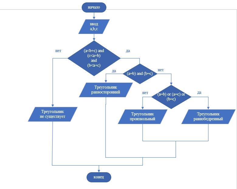 Составить программу и блок схему для определения вида треугольника ( равносторонний , равнобедренный,произвольный ) если его стороны известны???