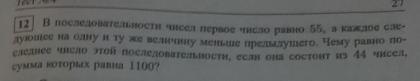 в последовательности чисел первое число равно 55 а каждое следующее на одну и ту же величину меньше преведущего.