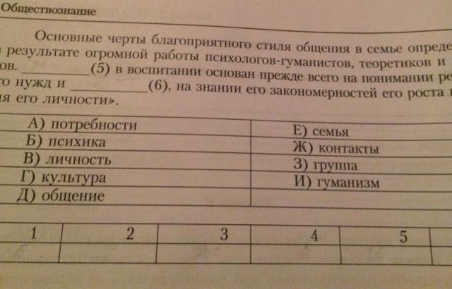 Основные черты благоприятного стиля общения в семье определились в результате огромной работы психологов-гуманистов ,теоретиков и практиков. _____5)в воспитании основан прежде всего на понимании ребёнка -его нужд и ____6),на знании его закономерностей его роста и развития его личности.