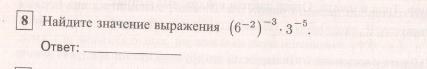 Сложновато. Проще так: (6⁻²)⁻³•3⁻⁵=6⁶•3⁻⁵=2⁶•3⁶•3⁻⁵=2⁶•3=64•3=192