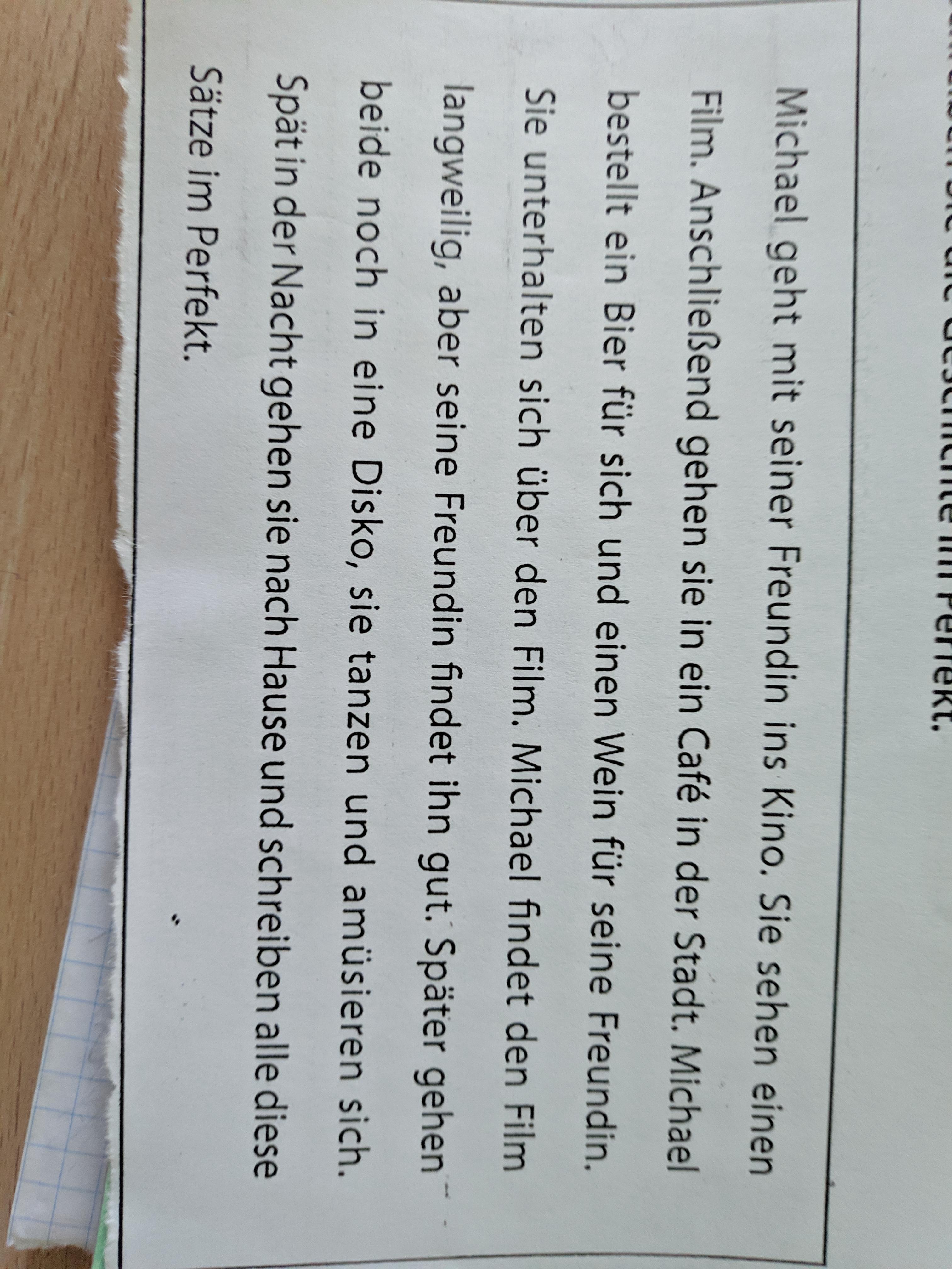 Michael ist mit seiner Freundin ins Kino gegangen. Sie haben einen Film gesehen. Anschließend sind sie in ein Cafe in der Stadt gegangen. Michael hat ein Bier für sich und einen Wein für seine Freundin bestellt. Sie haben sich über den Film unterhalten. Michael hat den Film langweilig gefunden, aber seine Freundin hat ihn gut gefunden. Später sind sie noch in eine Disko gegangen, sie haben getanzt und sich amüsiert. Spät in der Nacht sind sie nach Hause gegangen und haben alle diese Sätze im Perfekt geschrieben.