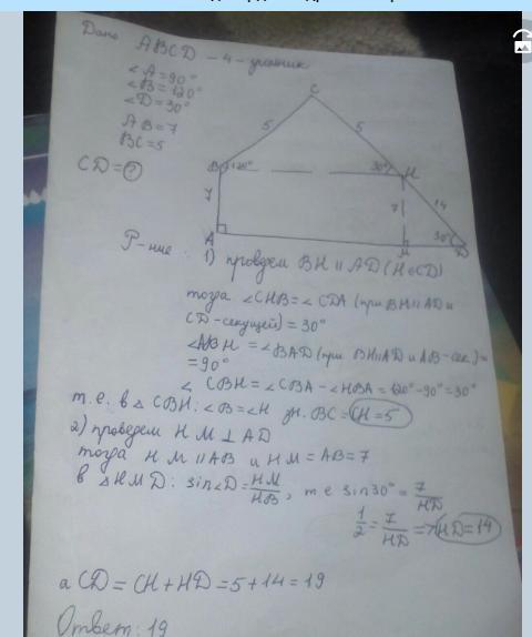 Дан четырехугольник ABCD, в котором ∠A=90°, ∠B=120°, ∠D=30°. Известно, что AB=1, BC=2. Найдите CD