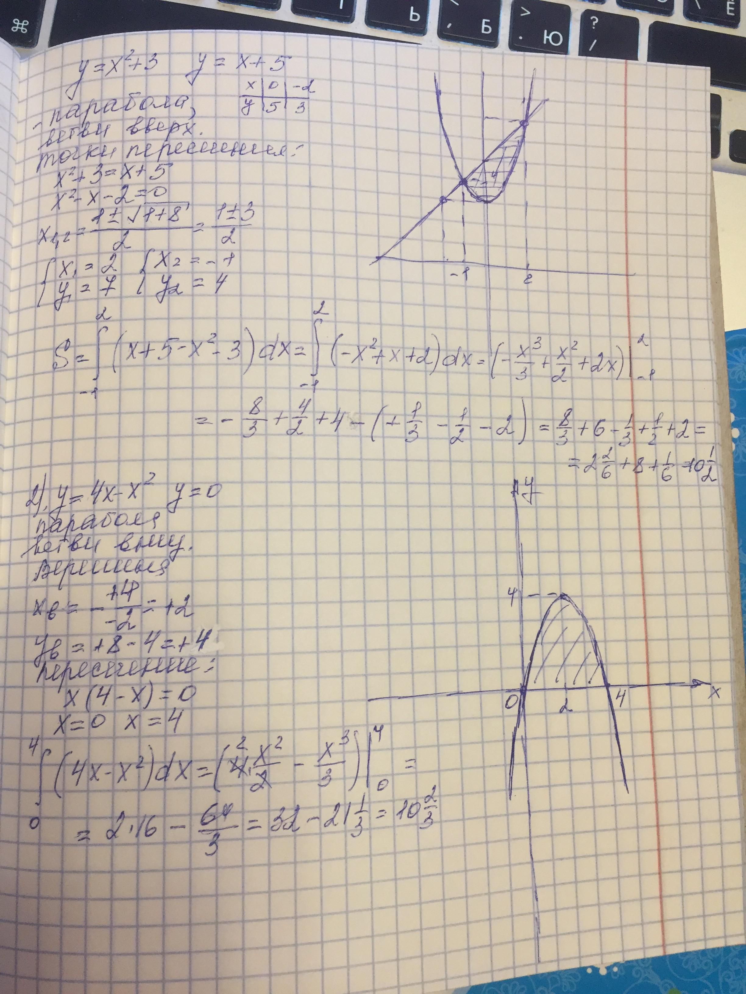 б) y=x²+3, y=x+5, в) y=4x - x², y=0
