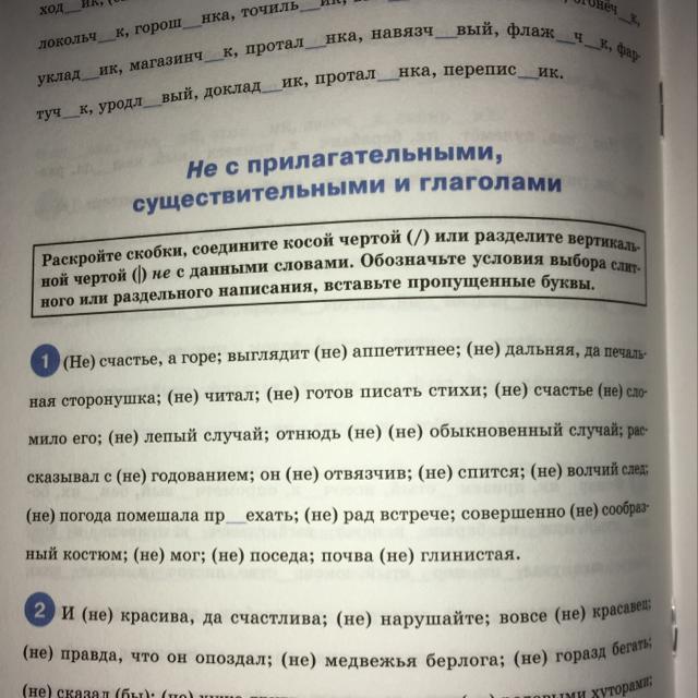 Не счастье, а горе; выглядит не аппетитнее; не дальняя, да печальная; не читал ; не готов писать стихи; несчастье не сломило его; нелепый случай; отнюдь не необыкновенный; рассказывал с негодованием; он неотвязчив; не спится; не волчий след; непогода помешала приехать; не рад встрече; несообразный костюм; не мог; непоседа; почва не глинистая