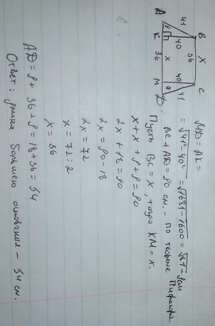Длина высоты BK равнобоковой трапеции ABCD, равна 40 см, боковая сторона 41 см, а сумма оснований равна 90 см. Найдите длину большего основания трапеции.