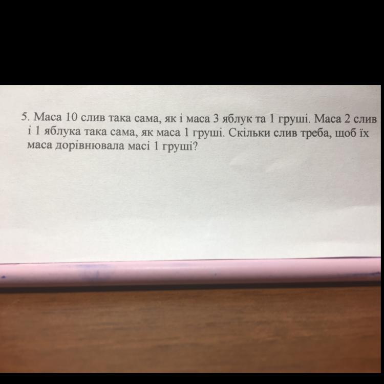 не уверена,но думаю если рассуждать логически, то если 2 сливы и 1 яблоко равны массе 1 груши то исключив 6 слив и 3 яблока,как бы сравнив их 3 раза с 1 грушей,то остается 4 сливы равные массе 1 груши