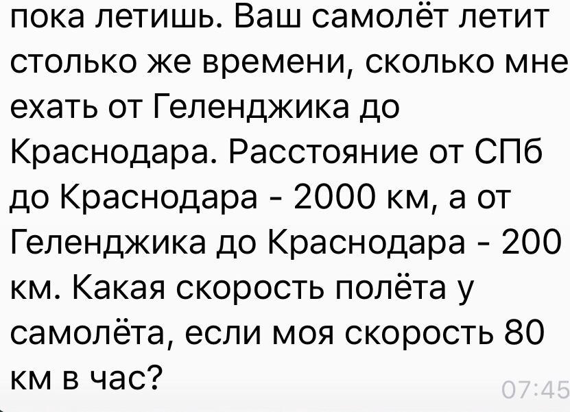 200 : 80 = 2,5 (час) - время в пути от Геленджика до Краснодара = время полета самолета от СПб до Краснодара.