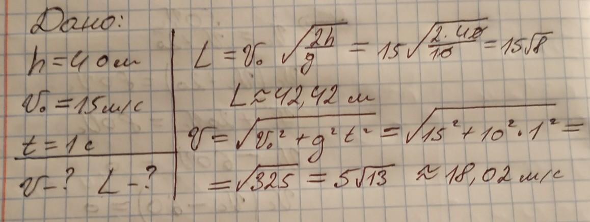 Тело брошено со скалы высотой 40 метров с горизонтальной скоростью 15 м/с. Найти скорость камня через 1 секунду от начала движения и максимальную дальность полёта