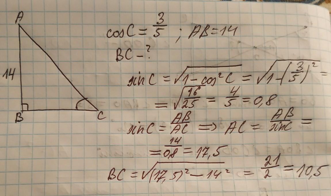 В Треугольнике ABC угол B равен 90 градусов, AB = 14, cosC= 3/5