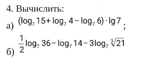 б) (1/2)*log₇36-log₇14-3*log∛21=log₇√36-log₇(2*7)-log₇(∛21)³=