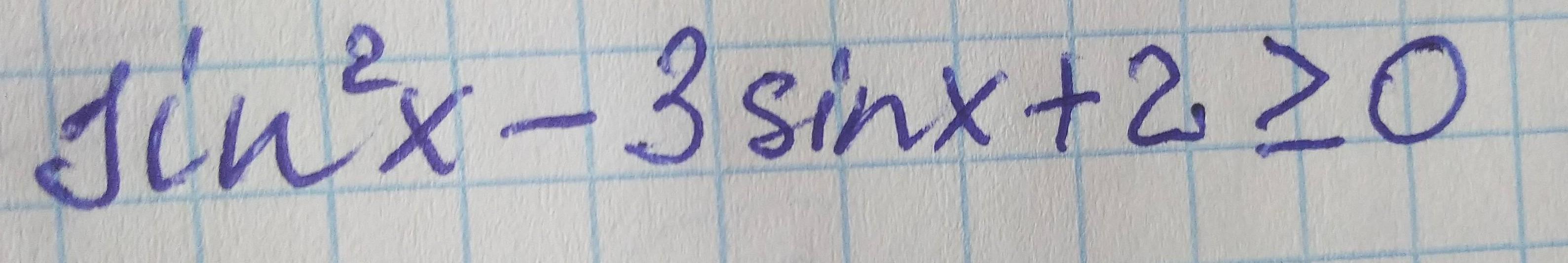 Решая уравнение sin²(x)-3*sin(x)+2=0, находим sin(x)=1 либо sin(x)=2. Но так как /sin(x)/≤1, то равенство sin(x)=2 невозможно. Запишем теперь данное неравенство в виде 3*[sin(x)-1]*[sin(x)-2]≥0. Так как sin(x)-2<0 при любом значении x, то неравенство 3*[sin(x)-1]*[sin(x)-2]>0 возможно только при sin(x)-1<0, т.е. при sin(x)<1. А это неравенство верно при любых значениях x, кроме значений x=π/2+2*π*n, где n∈Z. Но так как значение sin(x)=1 тоже удовлетворяет исходному неравенству, то отсюда следует, что оно справедливо при любых значениях x, т.е. при x∈(-∞;∞).