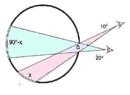 и 20°=(90°-х-а):2, откуда а=50°-х