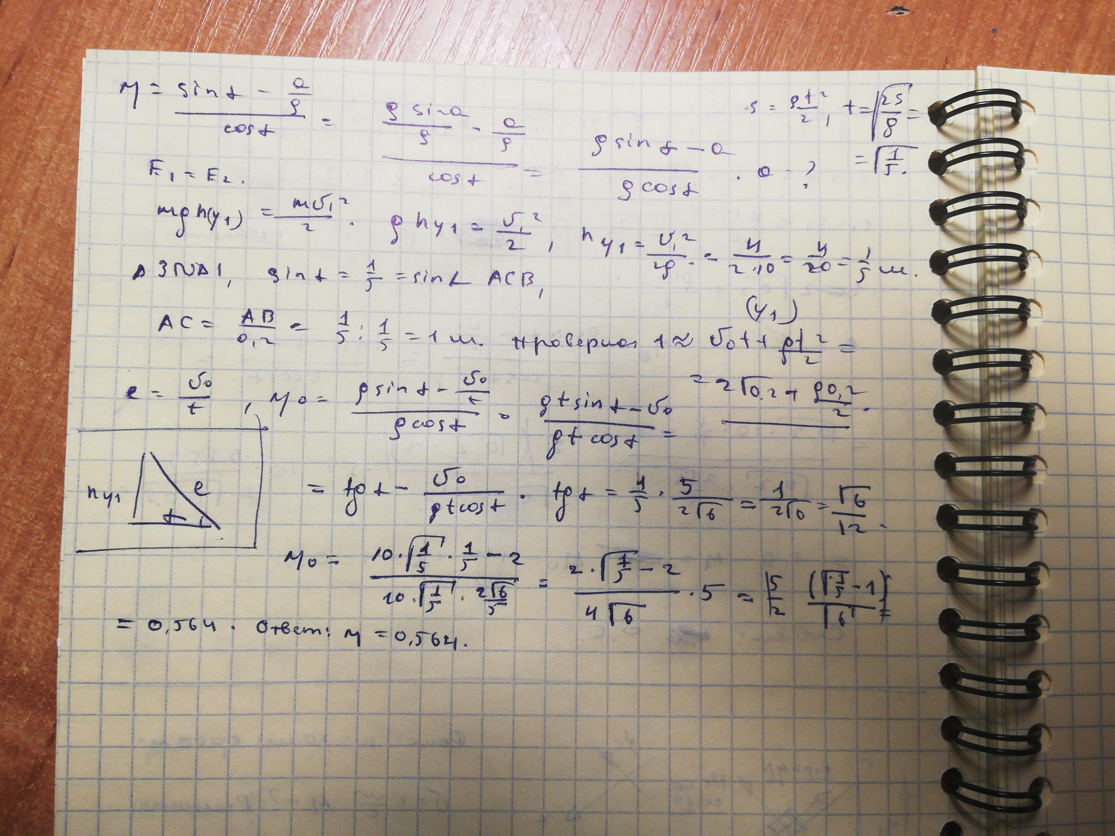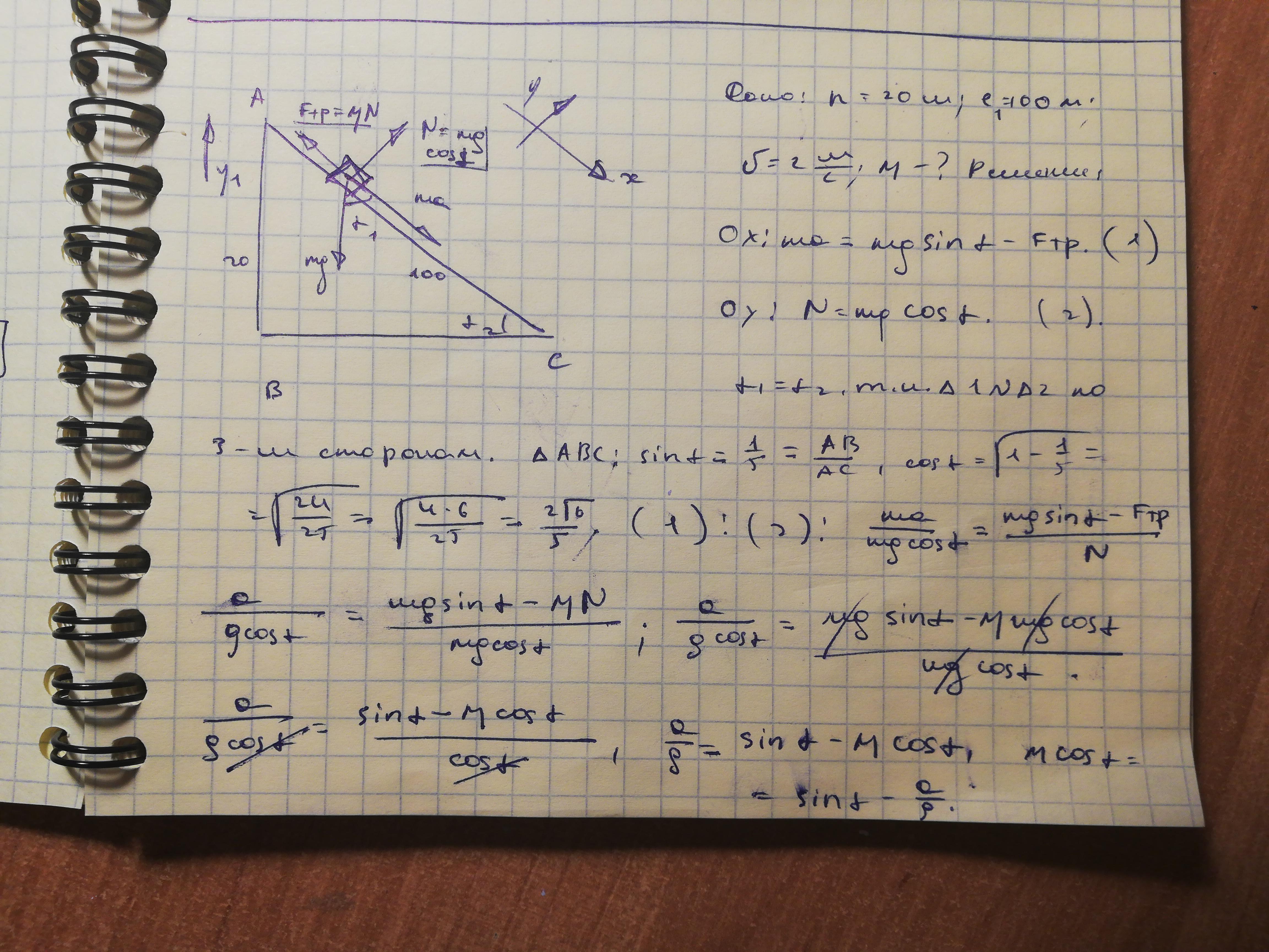 Помогите плиз!!! По склону горы скользит груз. Длина склона 100 м, высота 20 м. Определить коэффициент трения груза об склон, если скорость груза у основания горы равна 2м/с.