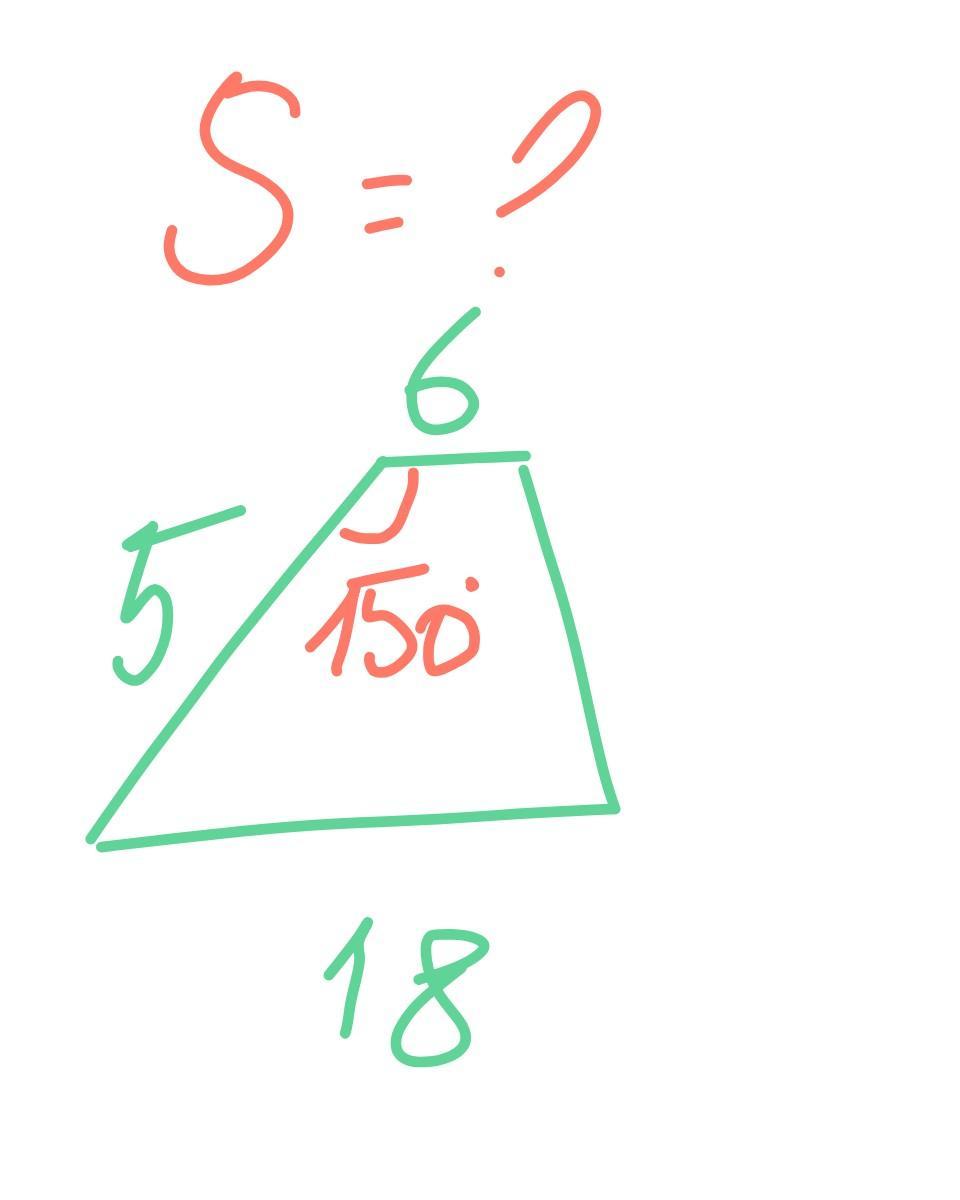 Основания трапеции равны 6 и 18. Боковая сторона равная 5 образует с одним из оснований угол 150°. Найти площадь трапеции.