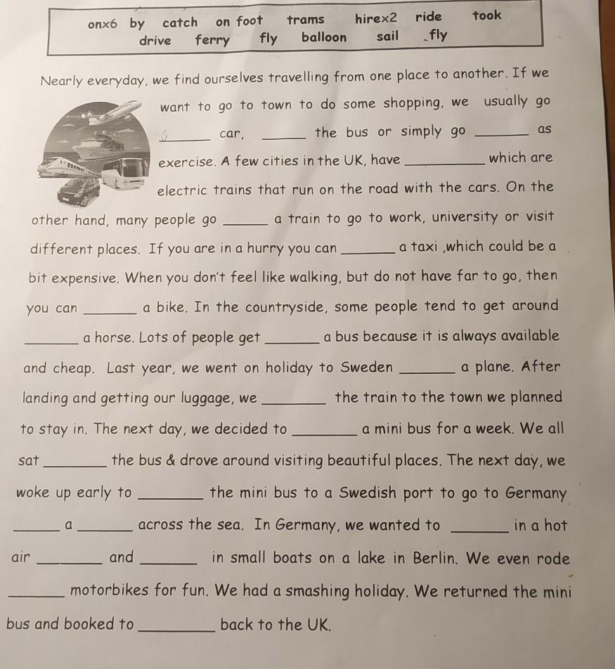 1by 2on 3on foot 4trams 5on 6catch 7ride 8. on 9 drive 10on t