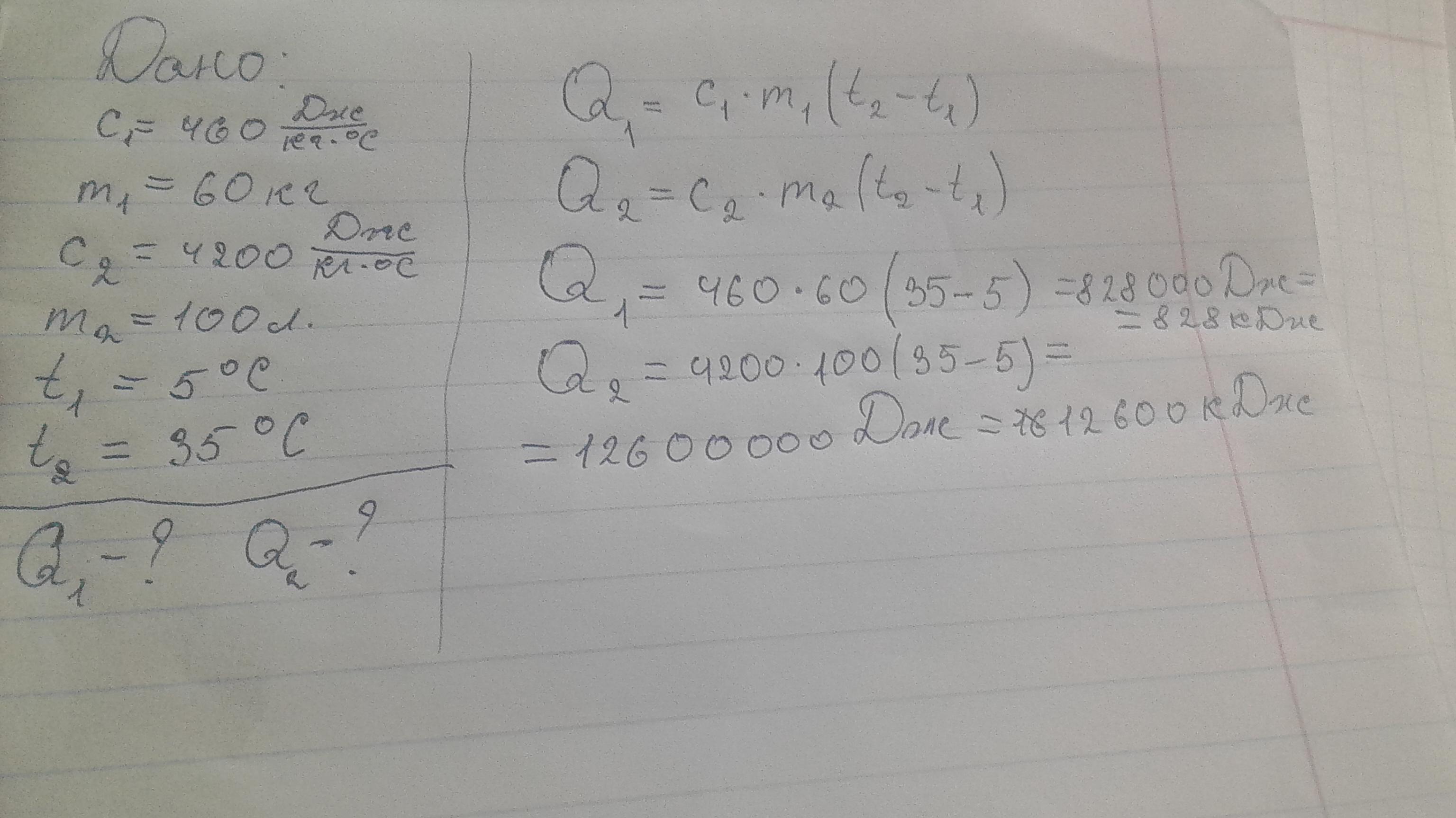 В железный душевой бак, масса которого 60 кг, налили холодной колодезной воды массой 100 л. В результате нагревания солнечным излучением температура воды повысилась от температуры 5 градусов до температуры 35 градусов. Какое количество теплоты получили бак и вода?