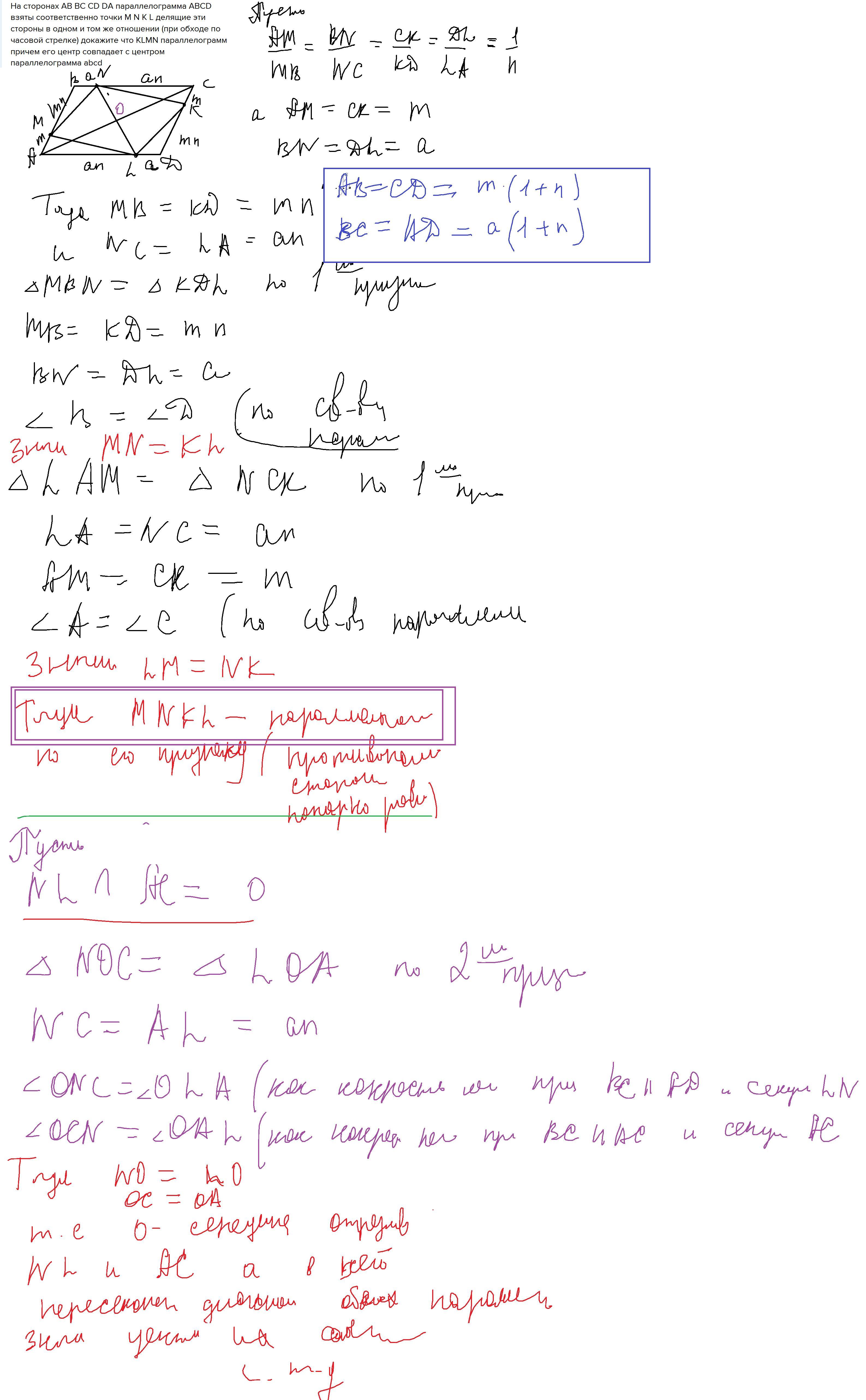 на сторонах AB BC CD DA параллелограмма ABCD взяты соответственно точки M N K L делящие эти стороны в одном и том же отношении (при обходе по часовой стрелке) докажите что KLMN параллелограмм причем его центр совпадает с центром параллелограмма abcd