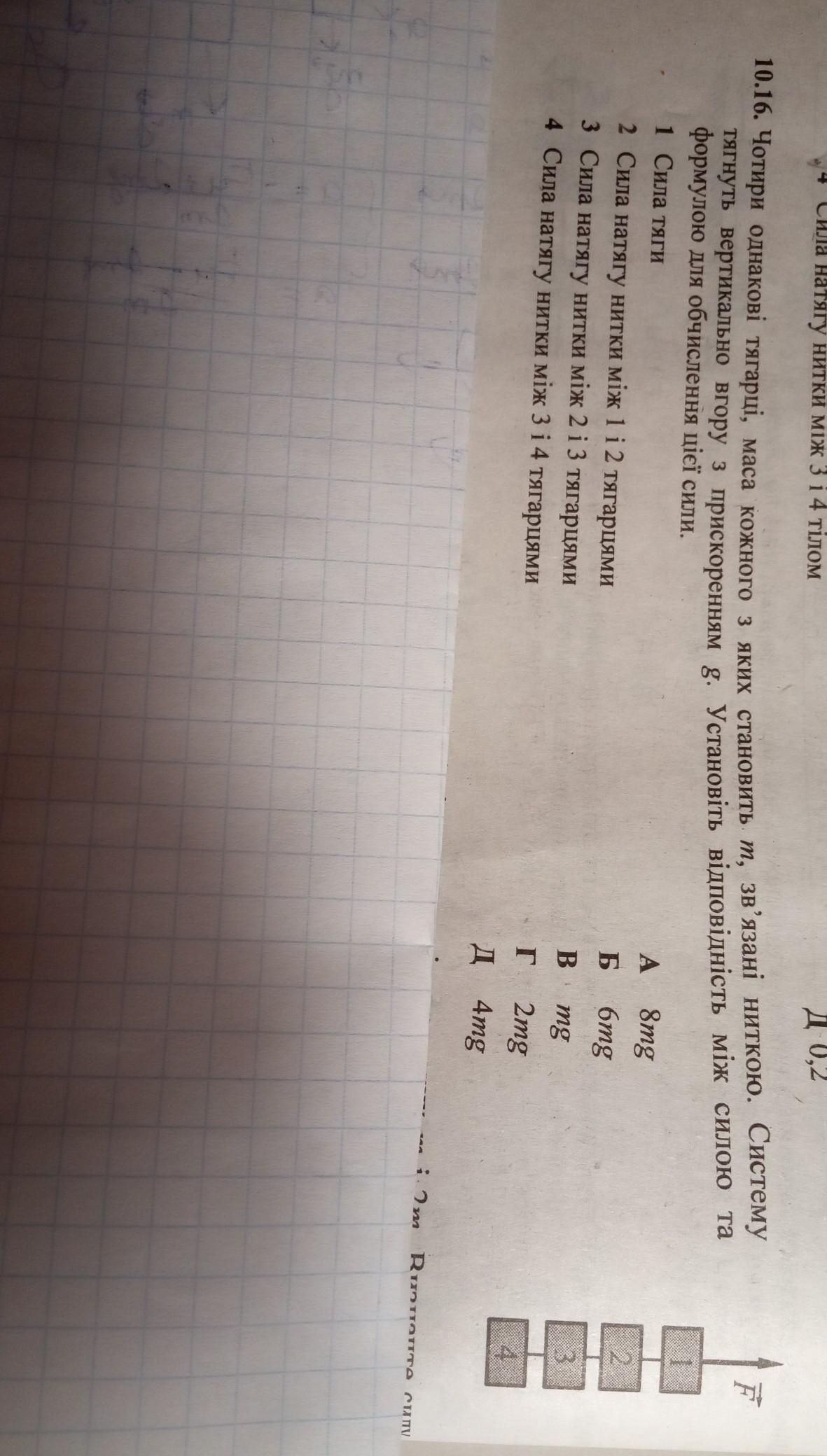 Четыре одинаковых груза маса каждый из которых m связаны нитью. Систему тащат вертикально вниз с ускорением g.