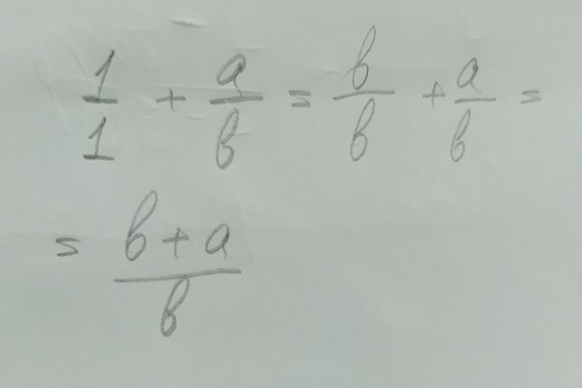 я добавила к своему ответу картинку. можете посмотреть. 1 мы можем представить как 1/1. Любое целое число можно так представить. например 5 будет 5/1. нам нужно чтоб нижняя часть была одинаковой, поэтому умножаем 1/1 на b сверху и снизу. получим b/b