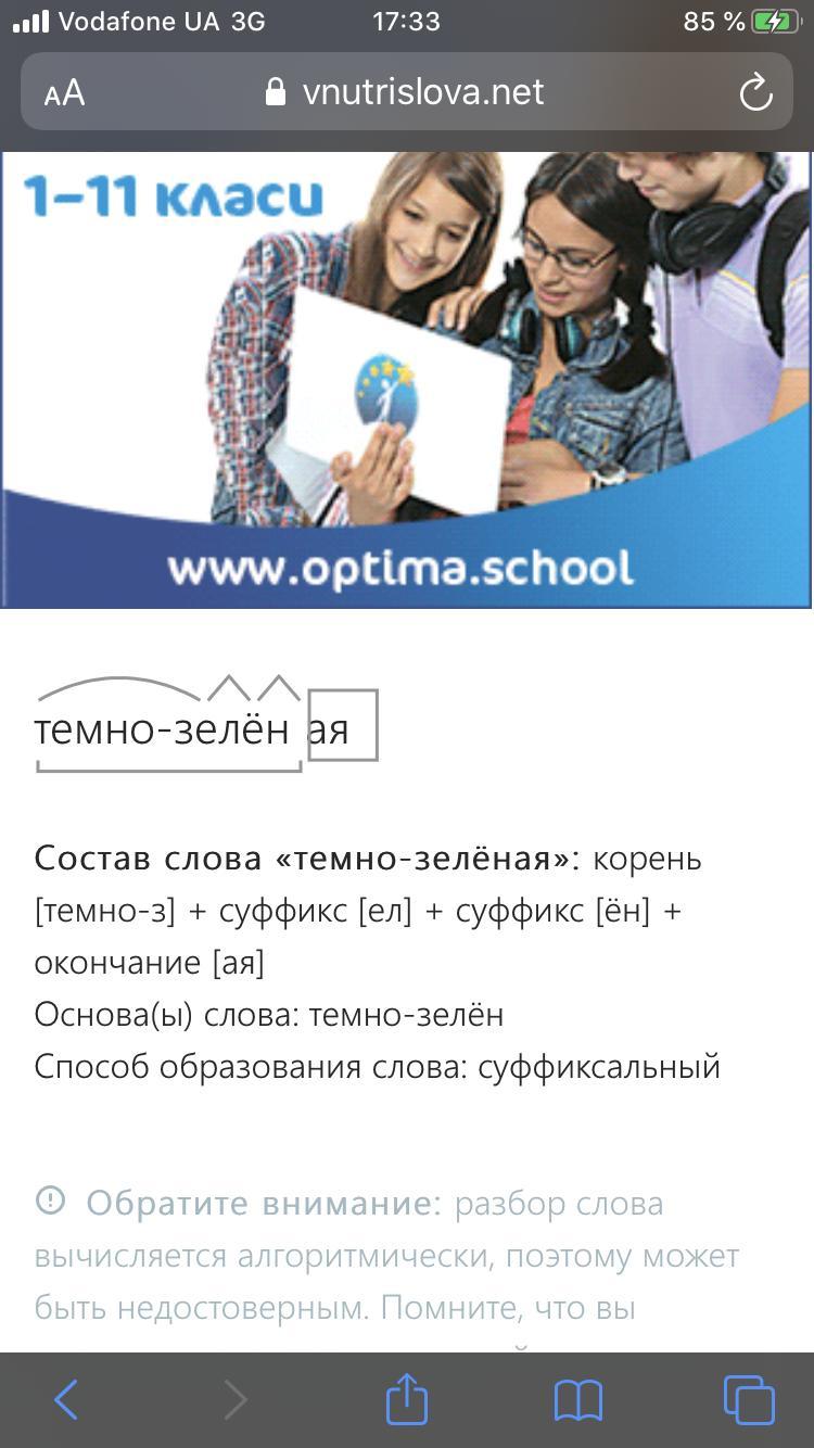Сделайте словообразовательный разбор слова: Темно-зеленую.