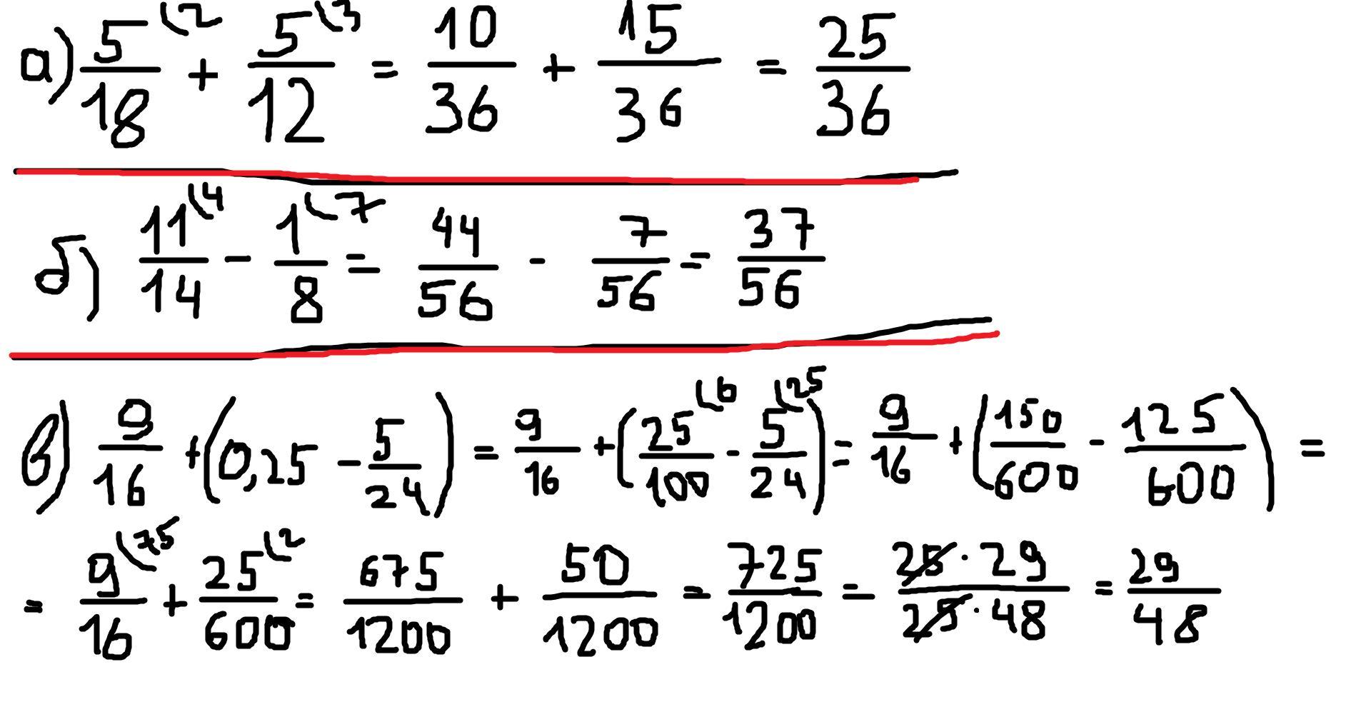 в)=9\16+1\4-5\24=27\48+12\48-10\48=29\48