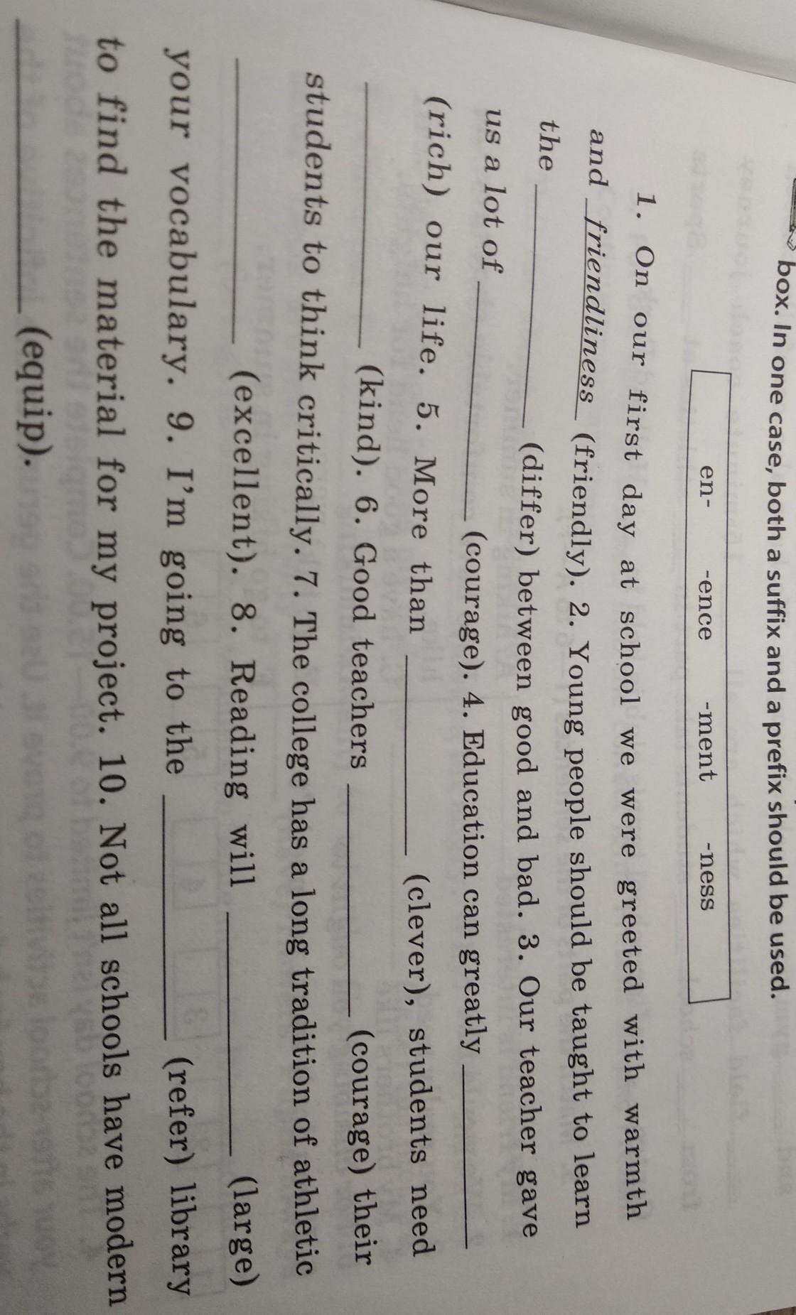 Change the words in brackets with the help of a suffix or a prefix from the box. In one case, both a suffix and a prefix should be used.