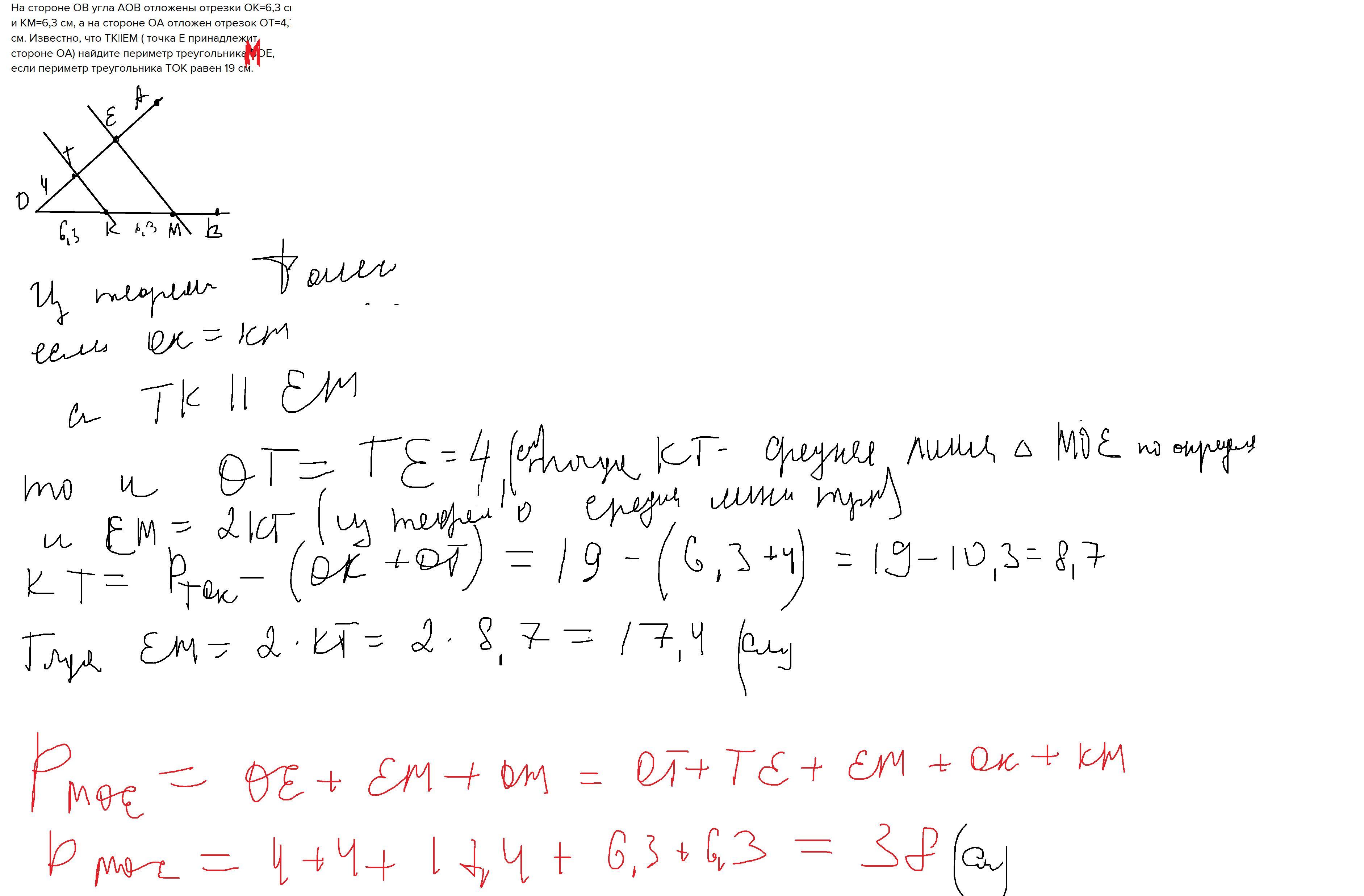 На стороне OB угла AOB отложены отрезки ОК=6,3 см и КМ=6,3 см, а на стороне ОА отложен отрезок ОТ=4,7 см. Известно, что ТК||ЕМ ( точка Е принадлежит стороне ОА) найдите периметр треугольника ВОЕ, если периметр треугольника ТОК равен 19 см.
