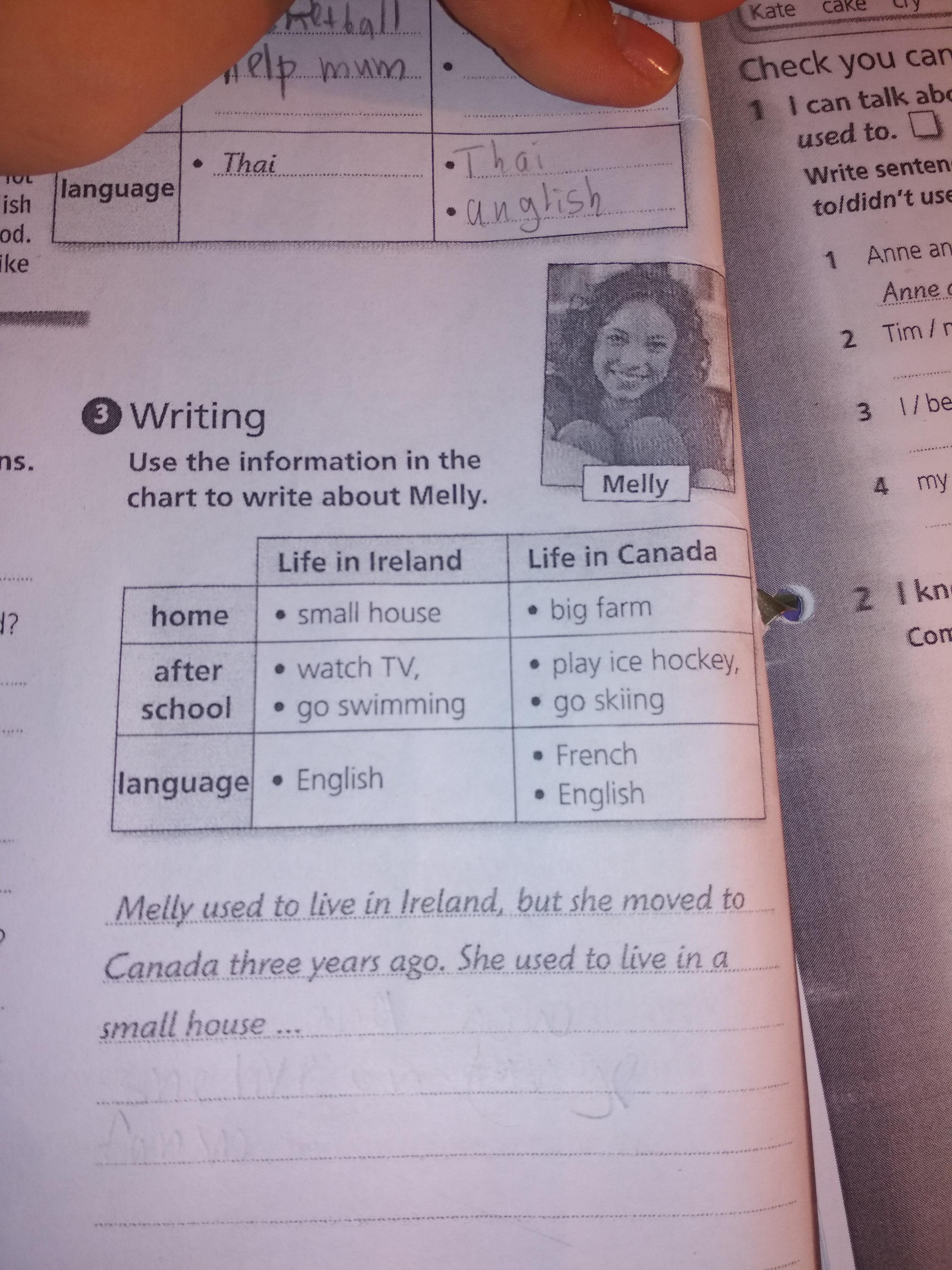 ...but now she lives on a big farm. After school she used to watch TV or go swimming, but now she plays ice hockey or goes skiing. She speaks English, but since she moved to Canada she learned to speak french.