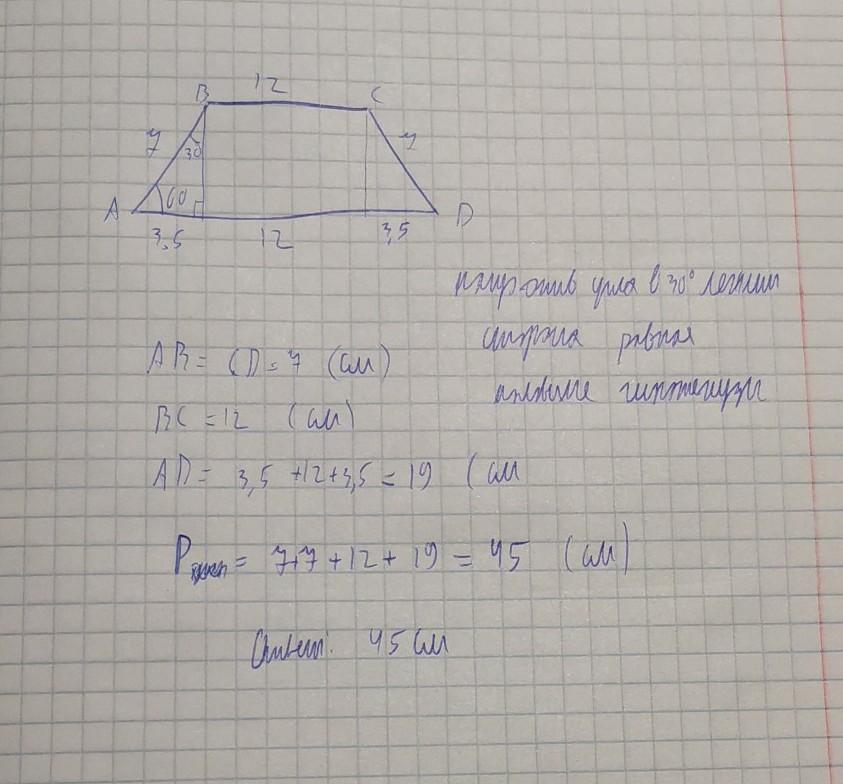 Меньшее основание равнобедренной трапеции 7 см,боковая сторона 12см,а острый угол при основании 60°.Найдите периметр данной трапеции.ПОМОГИТЕ ПОЖАЛУЙСТА!!!