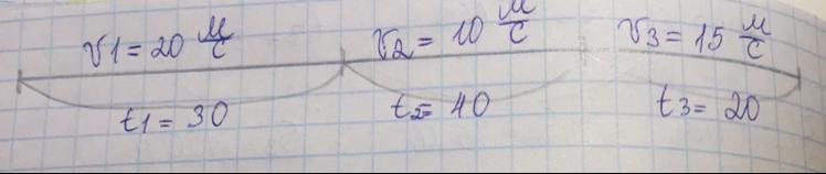 v1=20 м/с v2=10 м/с v3=15 м/с t1=30 c t2=40 c t3-20 c vcp=?