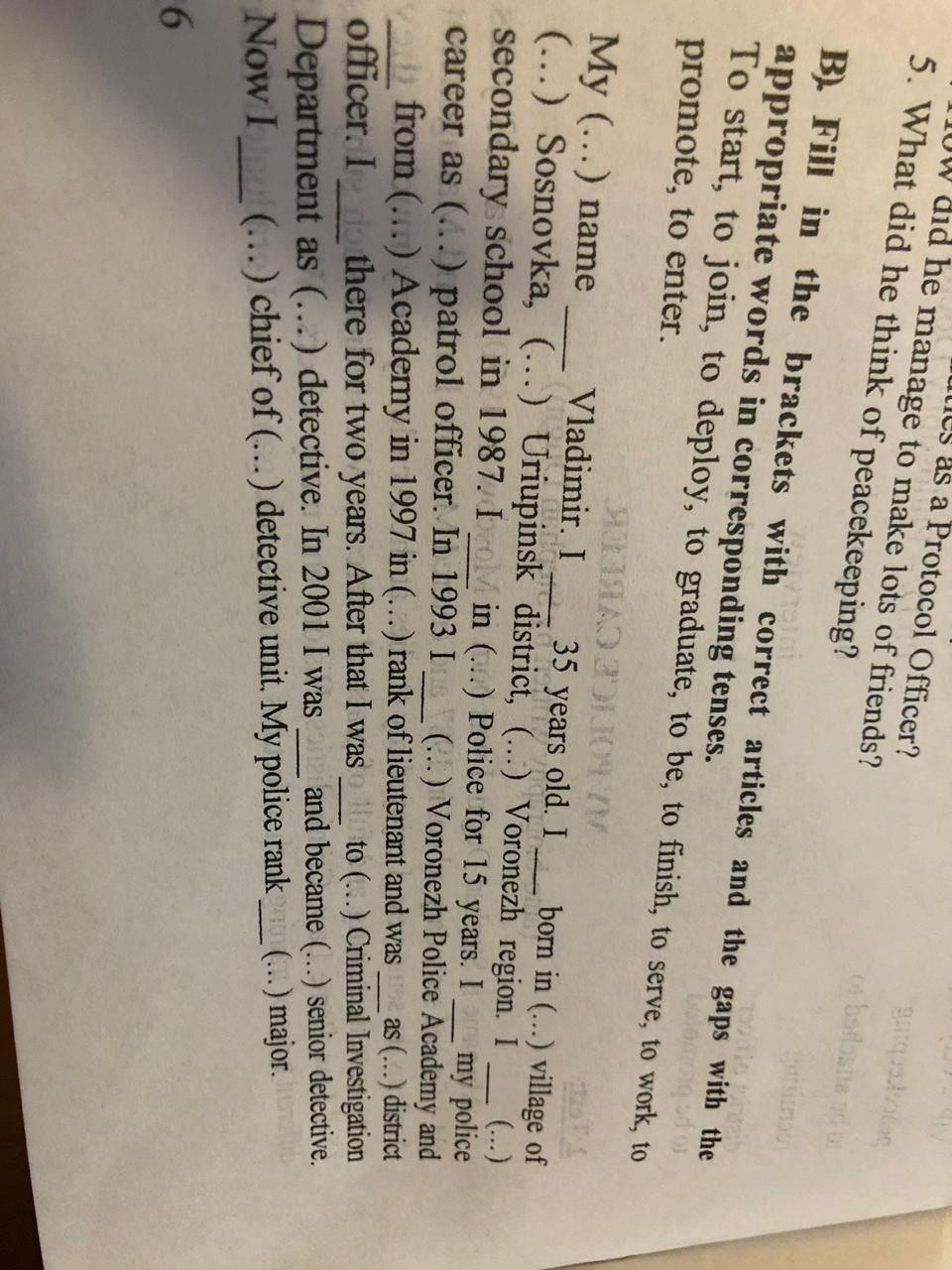 my name is Vladimir. I am.. . I was born in.. .I finished.. .I have been working.. . l started my...l joined.. . and served from.. . I was promoted.. . l worked. .. I was deployed.. I was graduated...l am. .. my police rank is.. .
