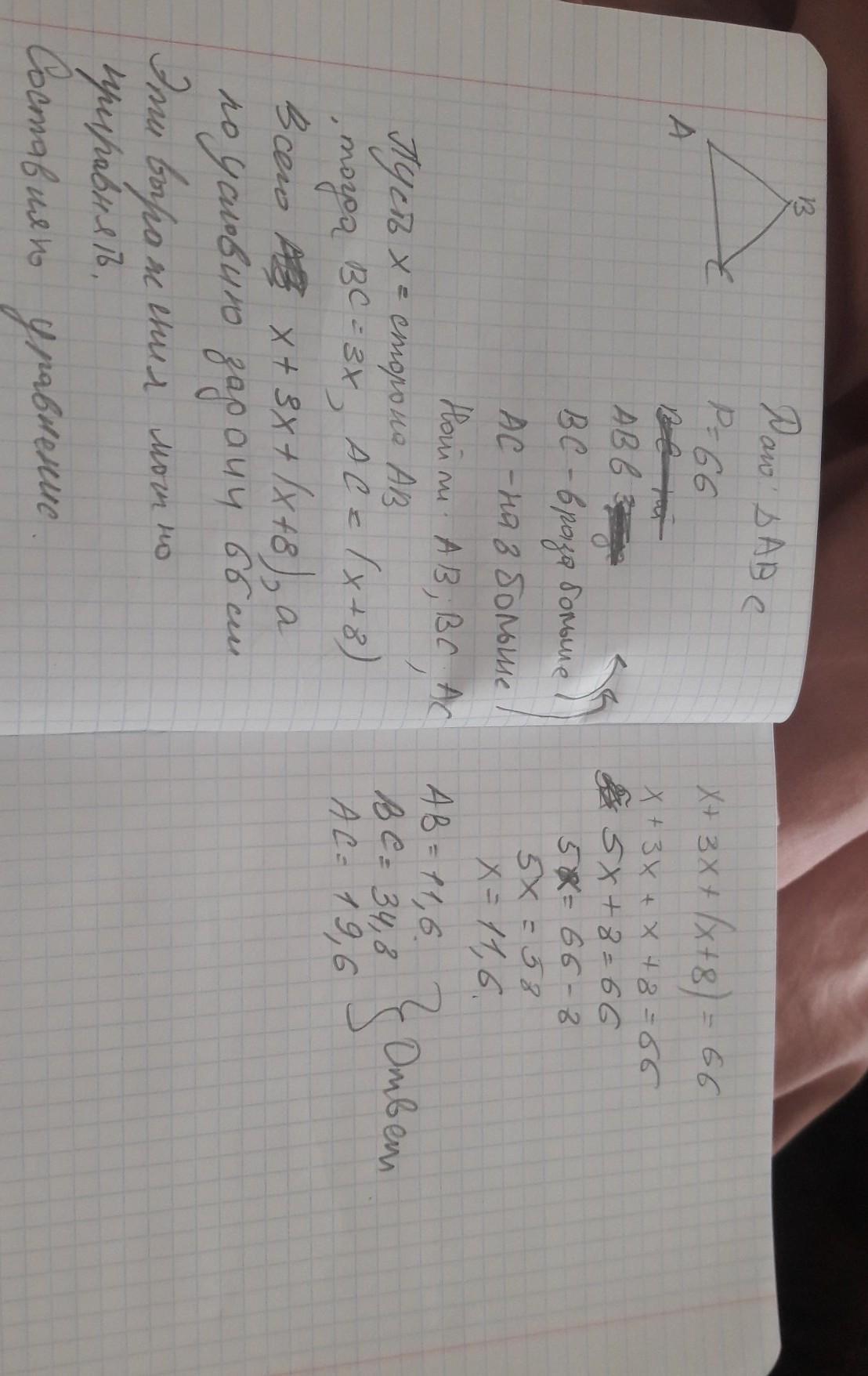 P abc =66 см, Сторона АВ в 3 раза меньше ВС и на 8см меньше стороны АС Найдите длины всех сторон авс