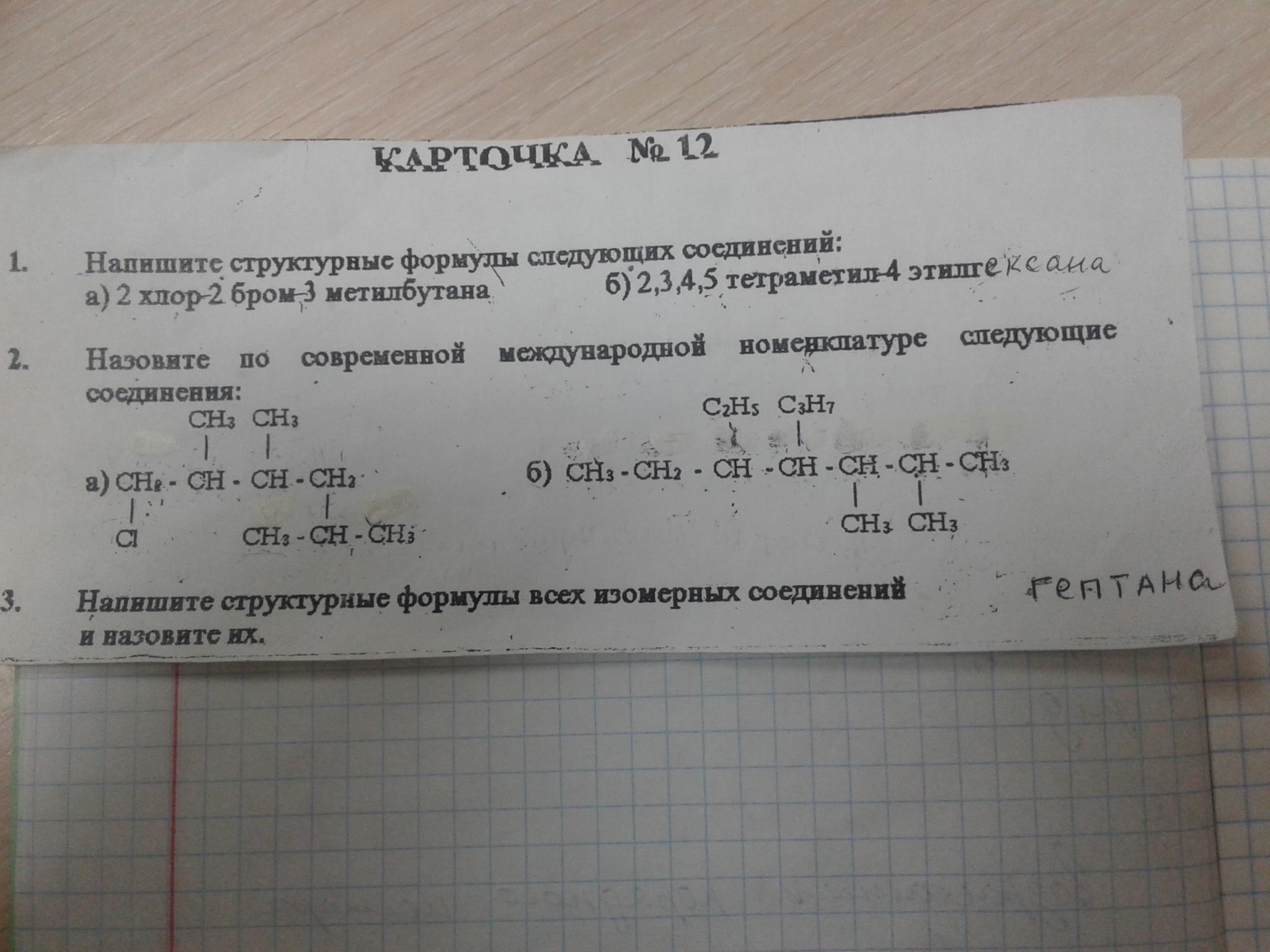 Напишите структурные формулы следующих соединений. 2хлор 2бром 3метилбутан. Пожалуйста помогите хоть что то из этого решить, срочно надо