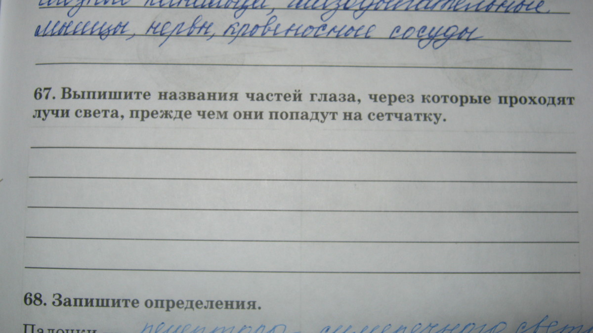67-Световые лучи от предметов проходят через зрачок, хрусталик и стекловидное тело.