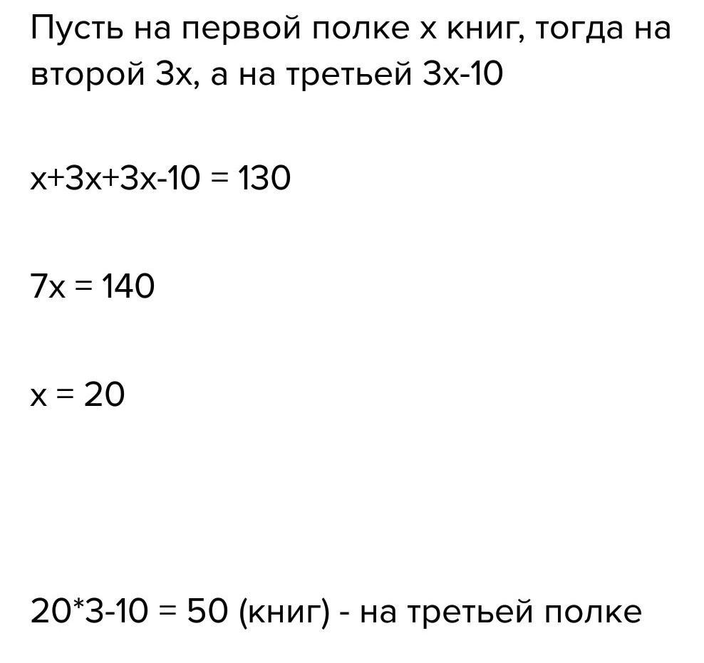 На трёх полках 130 книг. На второй полке в 3 раза больше,чем на первой, а на третьей полке на 10 книг меньше, чем на второй. Сколько книг га третьей полке?