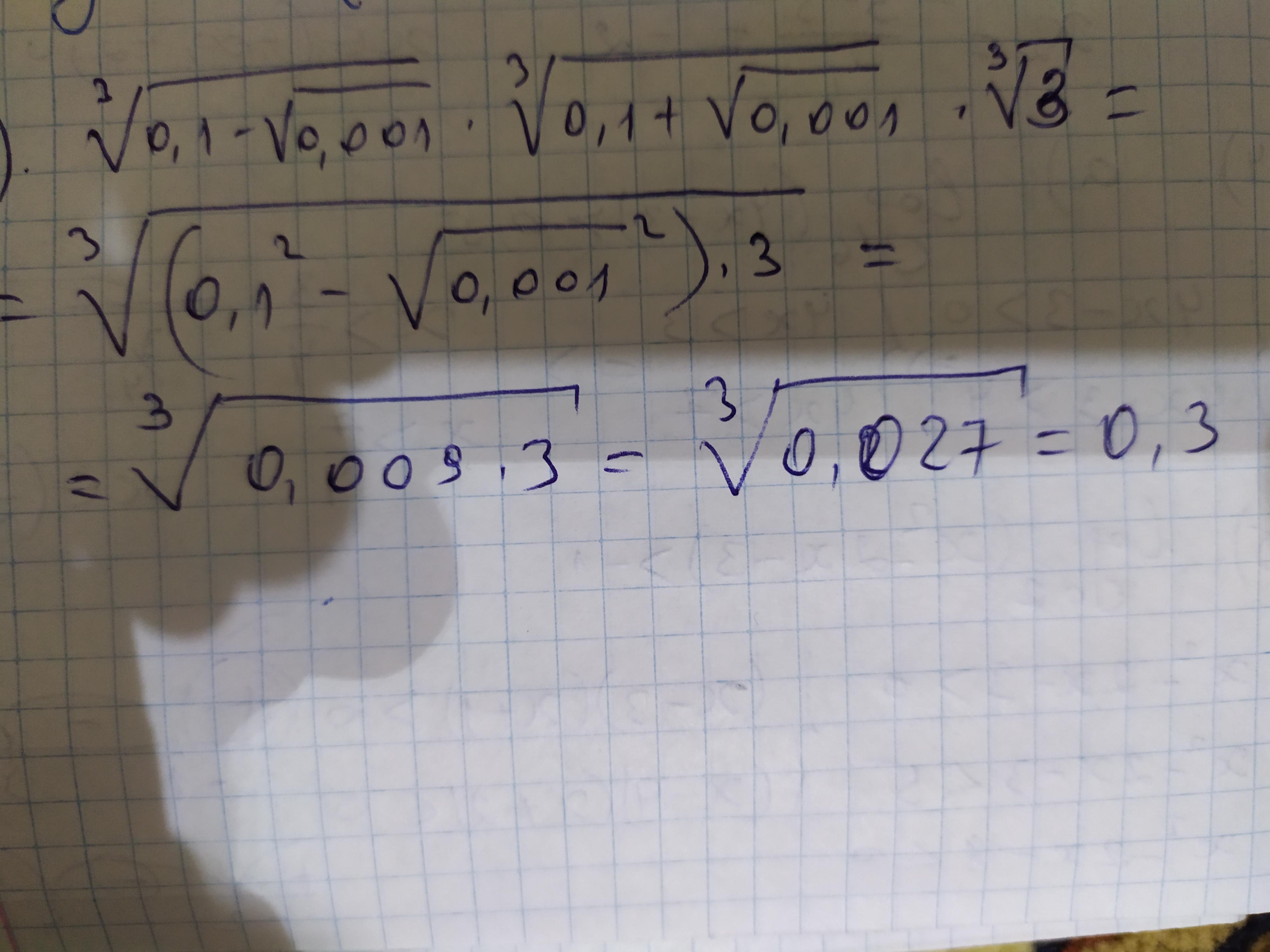 ∛((0,1)²-(√0,001)²)*3= ∛(0,01-0,001)*3= ∛-0,027= -0,3